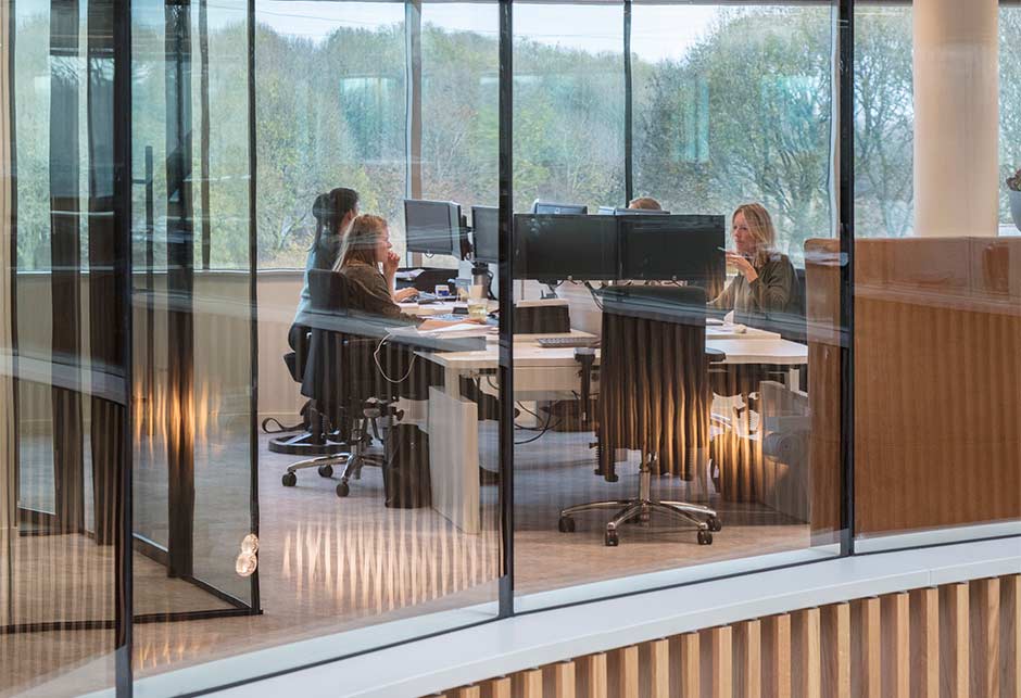 Het systeem JET-DC-GLAS is uitgevoerd in een lessenaarskap rond. De ronde vorm van de lessenaarskap voert de bijzondere vorm van het gebouw door in het interieur.