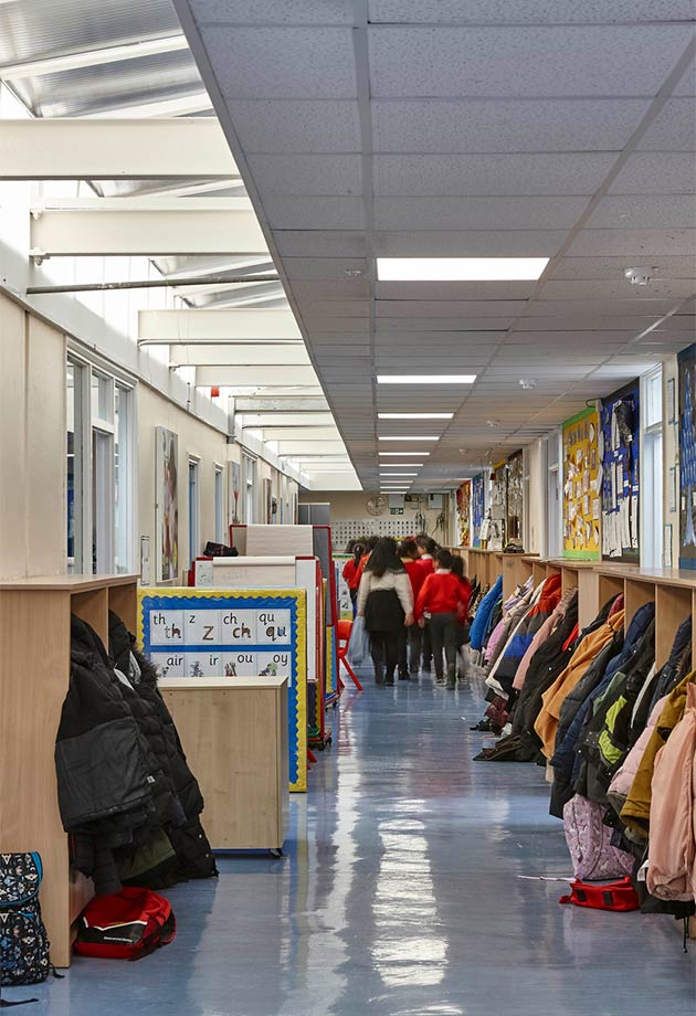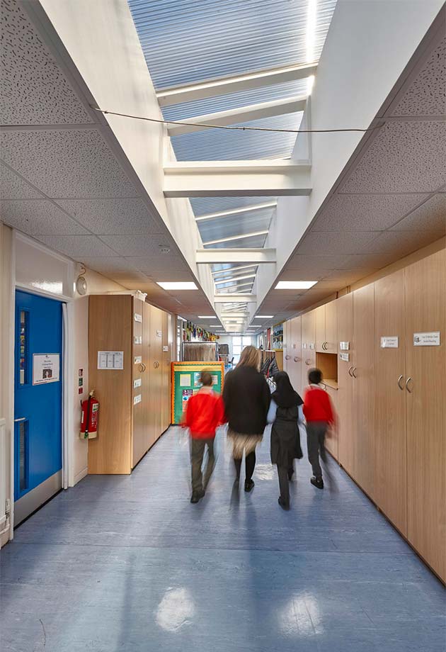 Honderd lichtkoepels en drie lichtstraten vullen de school met daglicht, wat bijdraagt aan goede leerprestaties