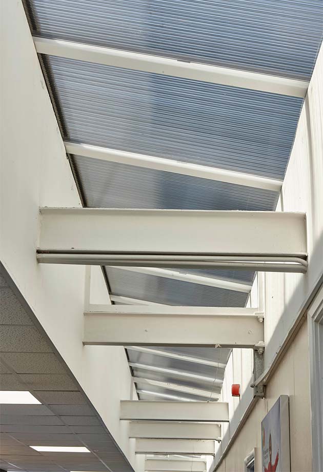 De grotere koepels bevatten gebronsde polycarbonaat beglazing, die schittering en warmteopbouw tegengaat. Een gebogen polycarbonaat overkapping overdekt de ontvangstruimte en biedt optimaal daglicht wanneer leerlingen en docenten de school binnen stappen. Een ander projectdoel was om minder afhankelijk te zijn van kunstverlichting en het energieverbruik te verlagen. Dat doel is bereikt met het vervangen van de lichtstraten.