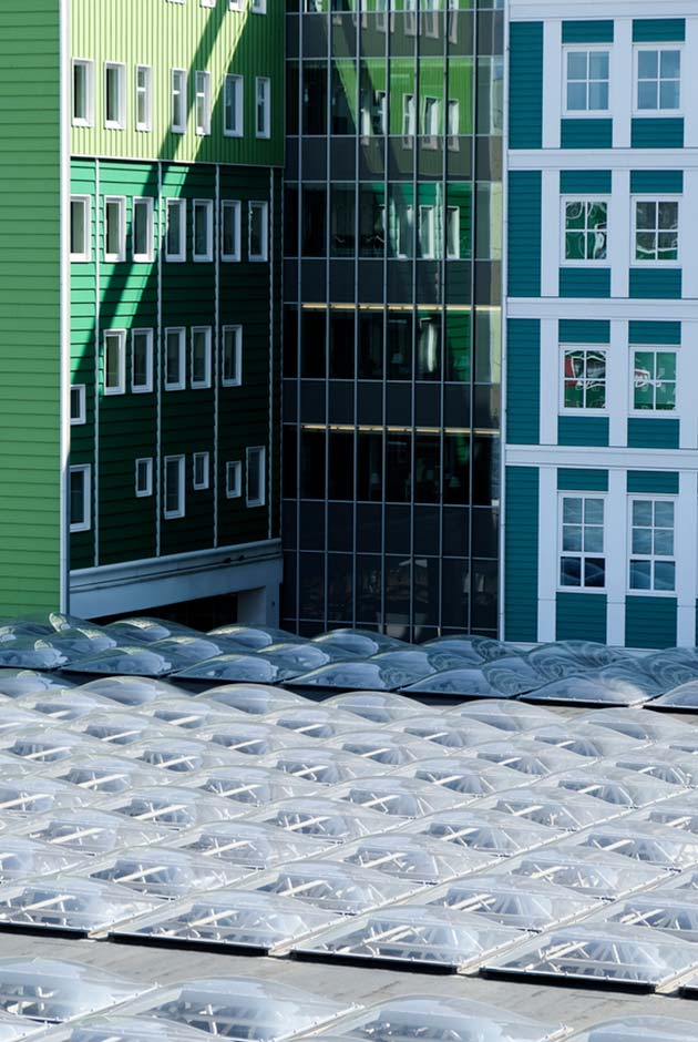 Donkere beglazing is geschikt voor gebouwen waar daglicht niet wenselijk is, maar kunststof materiaal nodig is om aan de brandveiligheidsvoorschriften te voldoen. Dankzij de zwarte PMMA buitenlaag valt er geen licht naar binnen. Rookafvoer is echter mogelijk, met of zonder RWA-systemen.